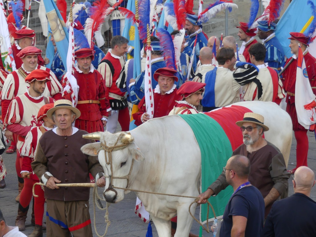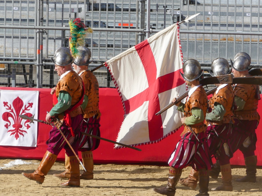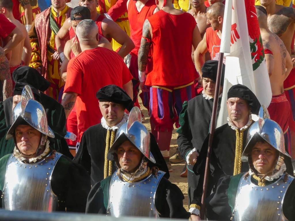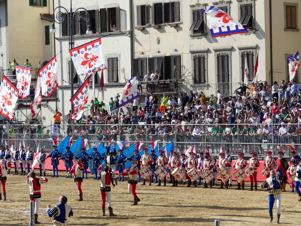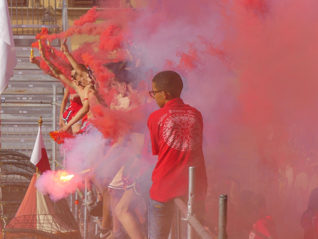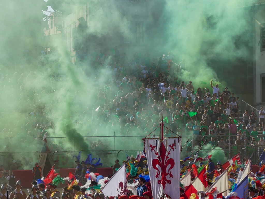 Each team are comprised of the 4 historic neighborhoods of Florence. Santa Maria Novella is Rossi (Red Team) and San Giovanni is Verdi (Green). Santo Spirito is Bianchi (white) and Santa Croce is Azzurri (blues). As with any sporting event, locals come out to support their local teams wearing their respective colors.